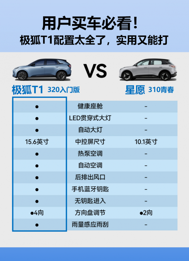 极狐T1在配置上可谓是诚意满满,入门版本就配备了诸多实用且高端的配置,真正做到了“入门即高配”。与吉利星愿410探索版相比,极狐T1的18寸轮毂不仅视觉效果更加大气,还能提升车辆的操控性和稳定性。在高速行驶时,更大的轮毂可以提供更好的抓地力,让车辆行驶更加平稳,减少侧滑的风险。带电动遮阳帘的全景天幕是极狐T1的一大亮点配置。它为车内乘客带来了开阔的视野和舒适的乘坐体验,让旅途更加愉悦。智能科技方面,极狐T1的8.8寸液晶仪表与15.6寸中控屏组合,集成了丰富的智能互联功能,操作流畅,信息显示清晰。通过语音控制系统,驾驶者可以轻松实现导航、播放音乐、调节空调等功能,让驾驶更加安全便捷。